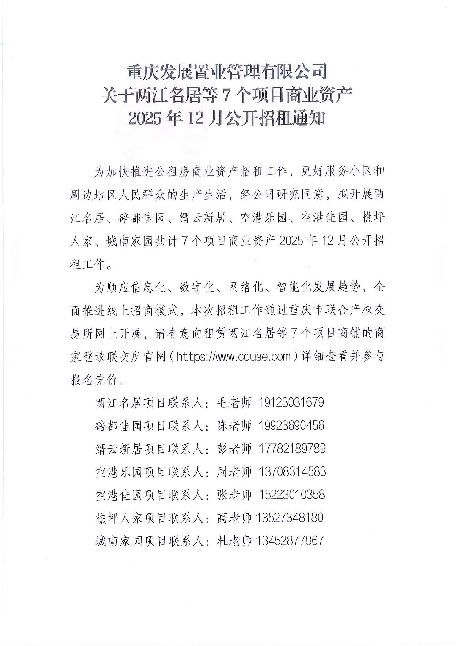 重庆发展置业管理有限公司关于两江名居等7个项目商业资产2025年12月公开招租通知