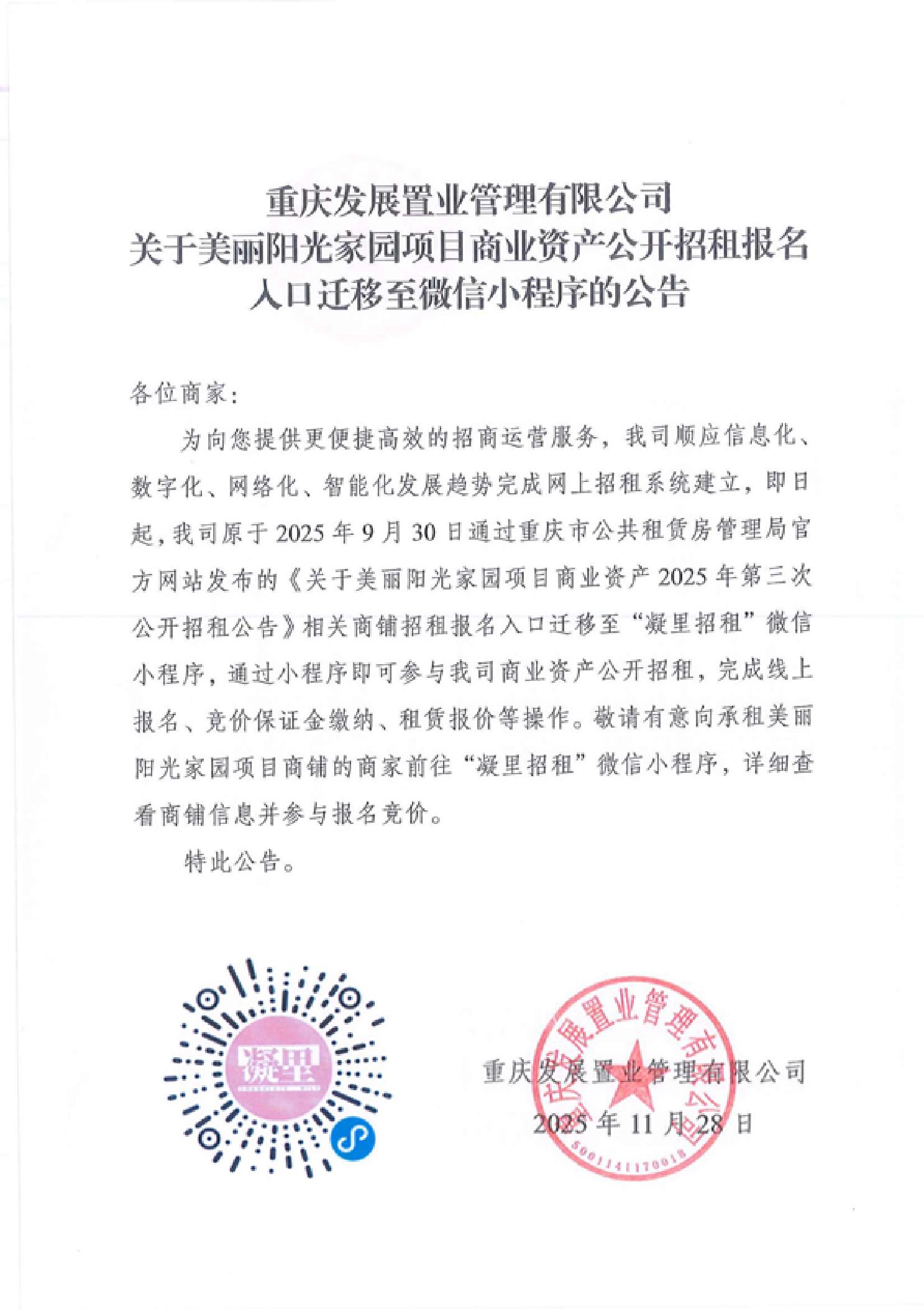 重庆发展置业管理有限公司关于美丽阳光家园项目商业资产公开招租报名入口迁移至微信小程序的公告