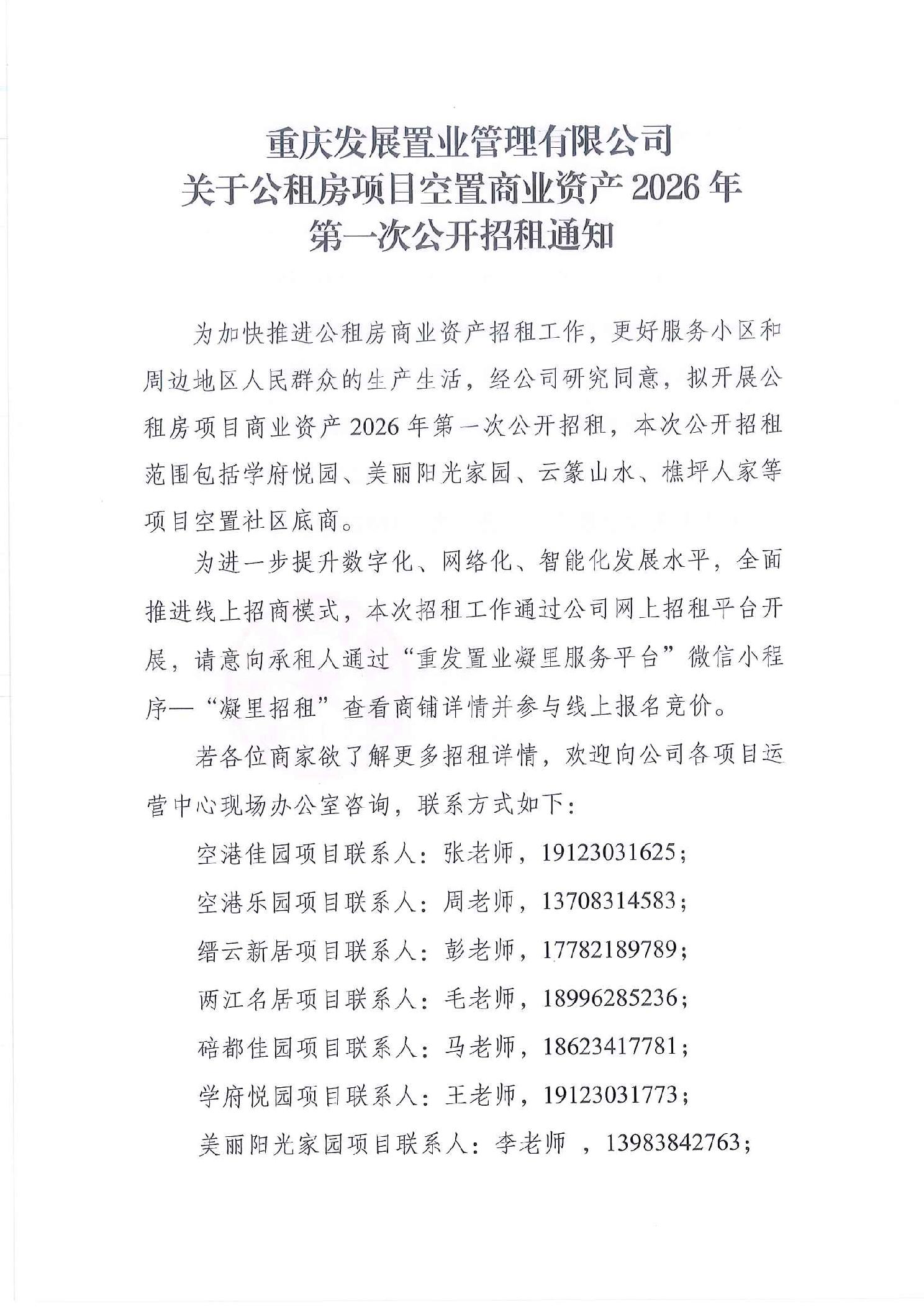 重庆发展置业管理有限公司关于公租房项目空置商业资产2026年第一次公开招租通知