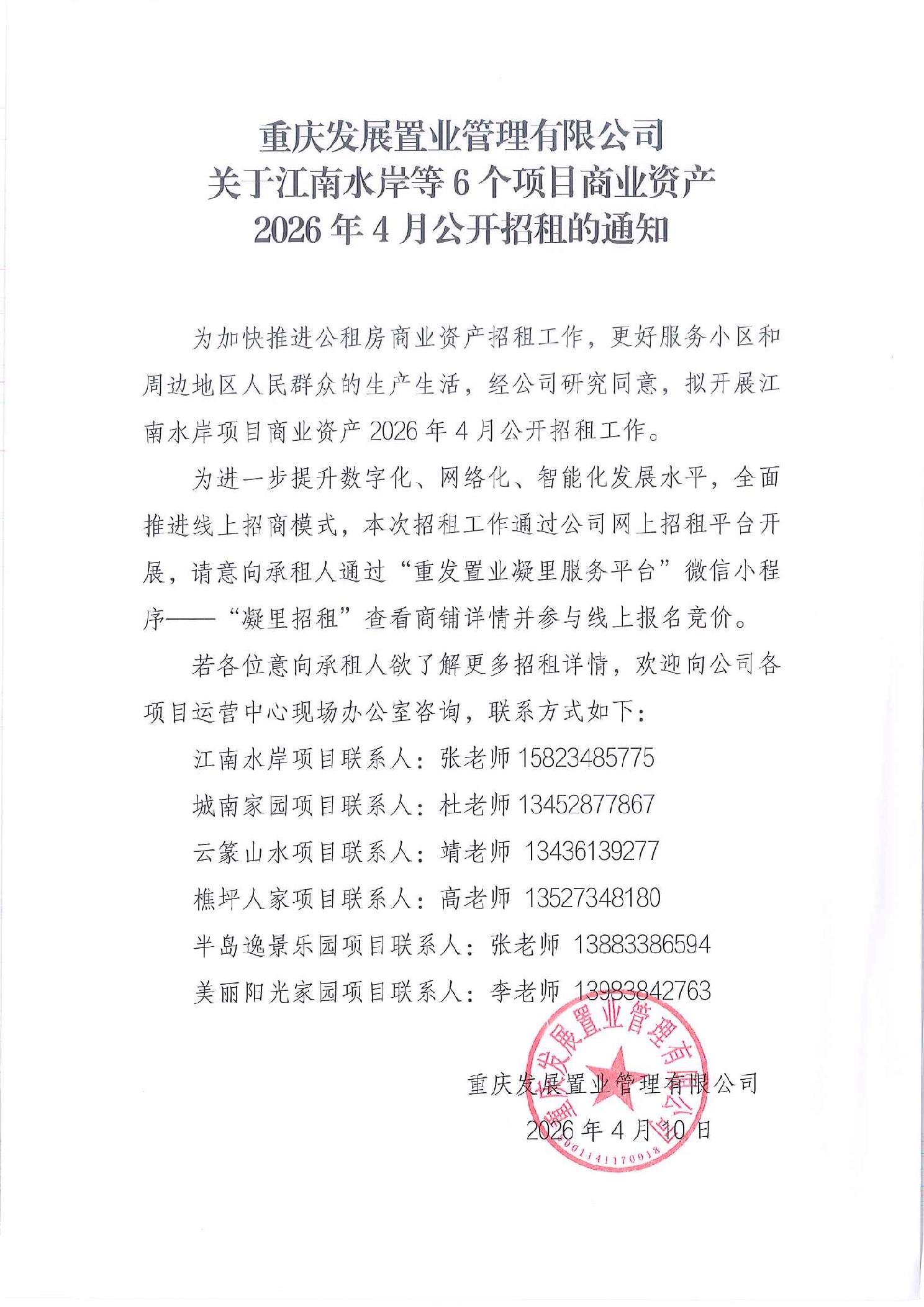 重庆发展置业管理有限公司关于江南水岸等6个项目商业资产2026年4月公开招租的通知