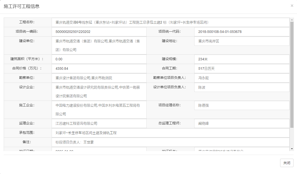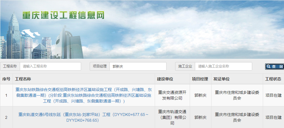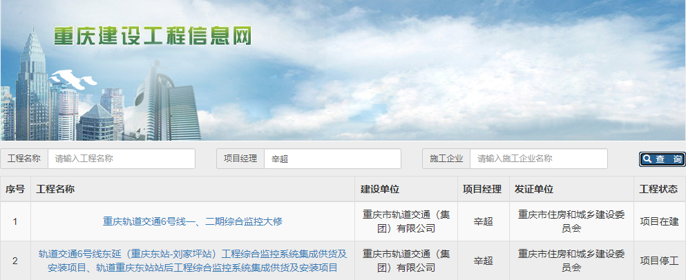 在“工程名称”处查询:重庆轨道交通6号线东延(重庆东站~刘家坪站)工程施工总承包土建2 标(刘家坪~长生停车场区间)