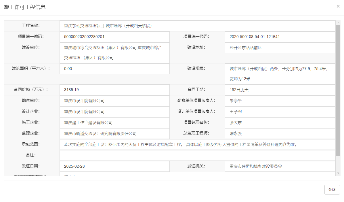 在“工程名称”处查询:重庆东站交通枢纽项目-城市通廊(开成路天桥段)
