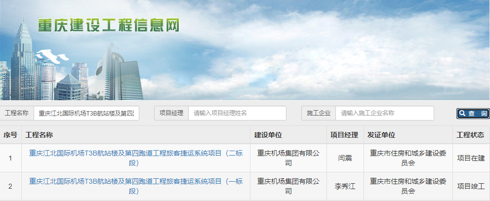在“工程名称”处查询:重庆江北国际机场T3B航站楼及第四跑道工程旅客捷运系统项目(二标段)