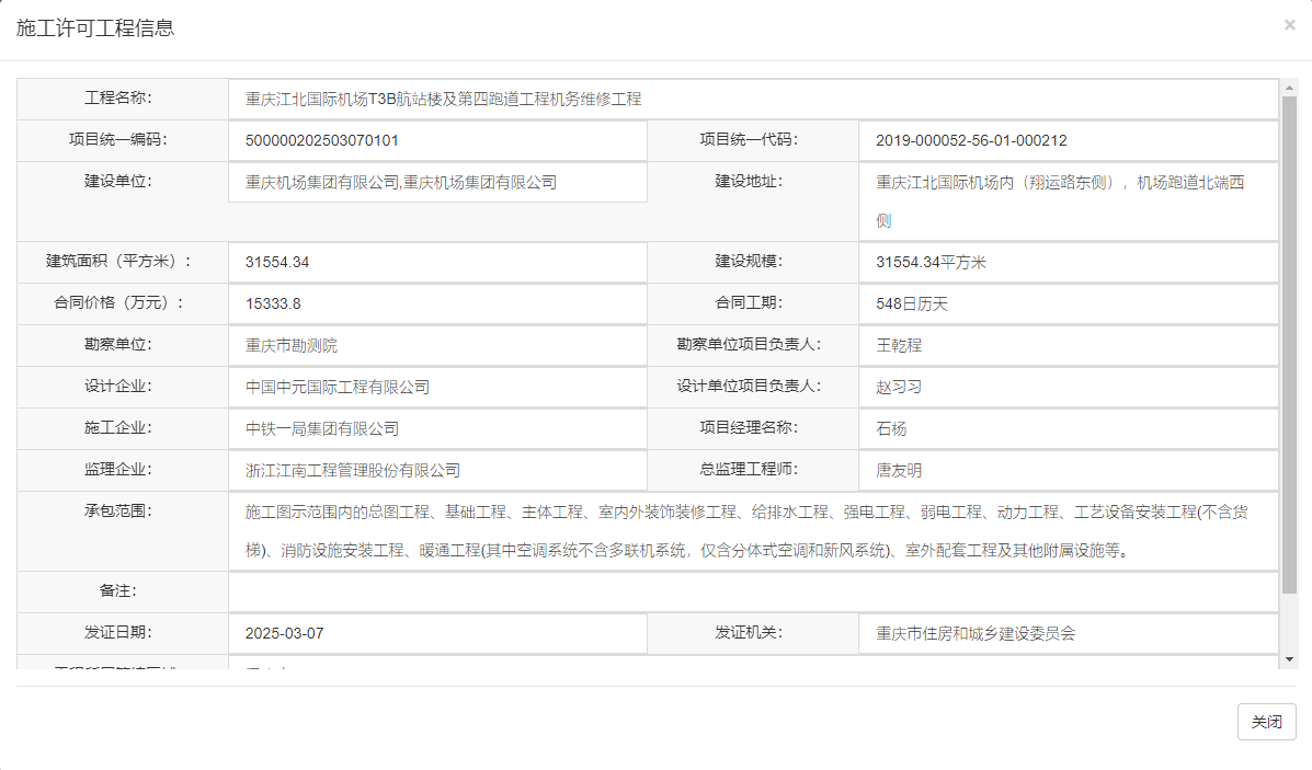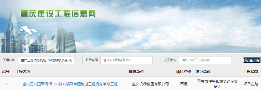 在“工程名称”处查询:重庆江北国际机场T3B航站楼及第四跑道工程机务维修工程