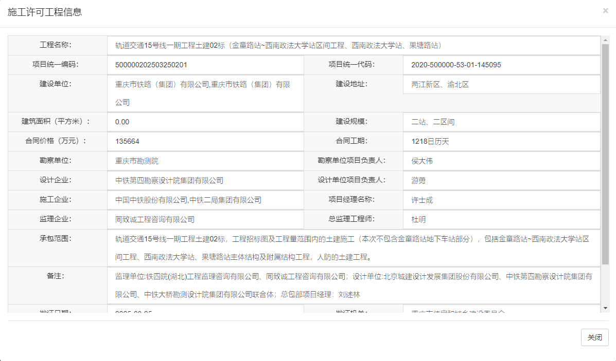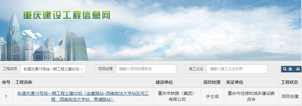 在“工程名称”处查询:轨道交通15号线一期工程土建02标(金童路站~西南政法大学站区间工程、西南政法大学站、果塘路站)