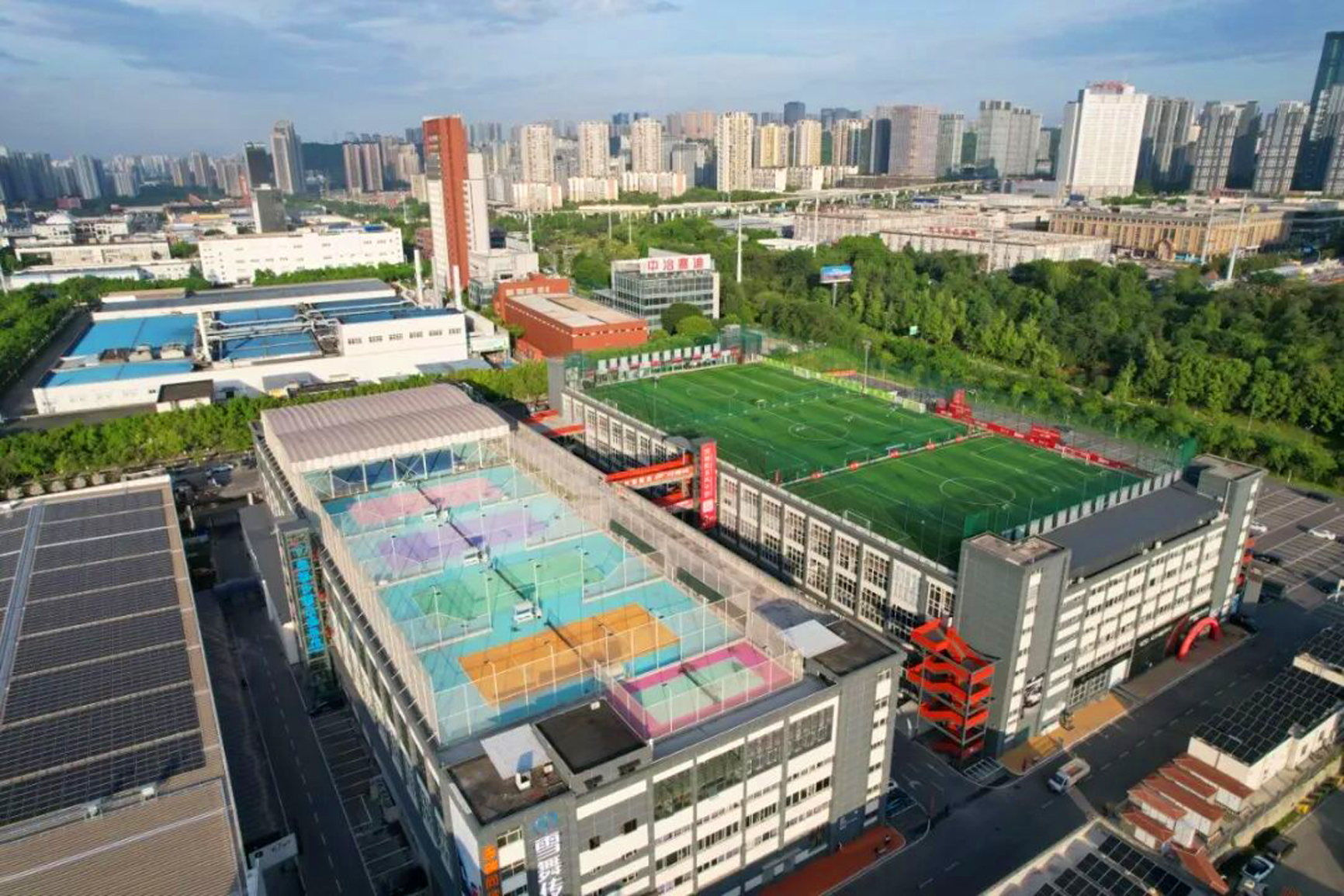 走进万虎创意园,眼前的景象让人眼前一亮:黄色的老厂房外墙变成了灰白相间的现代建筑,楼顶的足球场、彩色网球场格外亮眼。星级酒店、宴会中心、汽车改装、餐饮培训……多元业态在此交织,游客打卡拍照的身影随处可见。